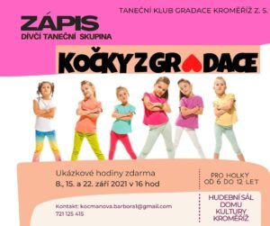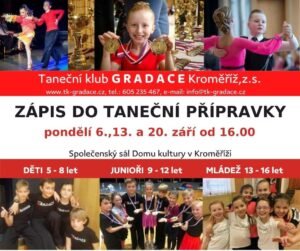 Od září startují v TK Gradace Kroměříž Broučci pro děti již od 1,5 roku a nový kroužek Hýbánky od 3 let. Otevíráme také další skupinu pro dívky – Kočky z Gradace. Zveme vaše děti také na zápis do Taneční přípravky standardních a latinskoamerických tanců. Pro informace a přihlášení nás neváhejte kontaktovat.
