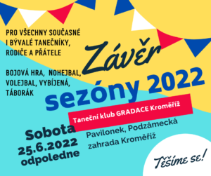 Závěr taneční sezóny TK Gradace 2022Zveme všechny naše současné a bývalé členy, rodiče a přátelé na Závěr taneční sezóny TK Gradace 2022. 0
